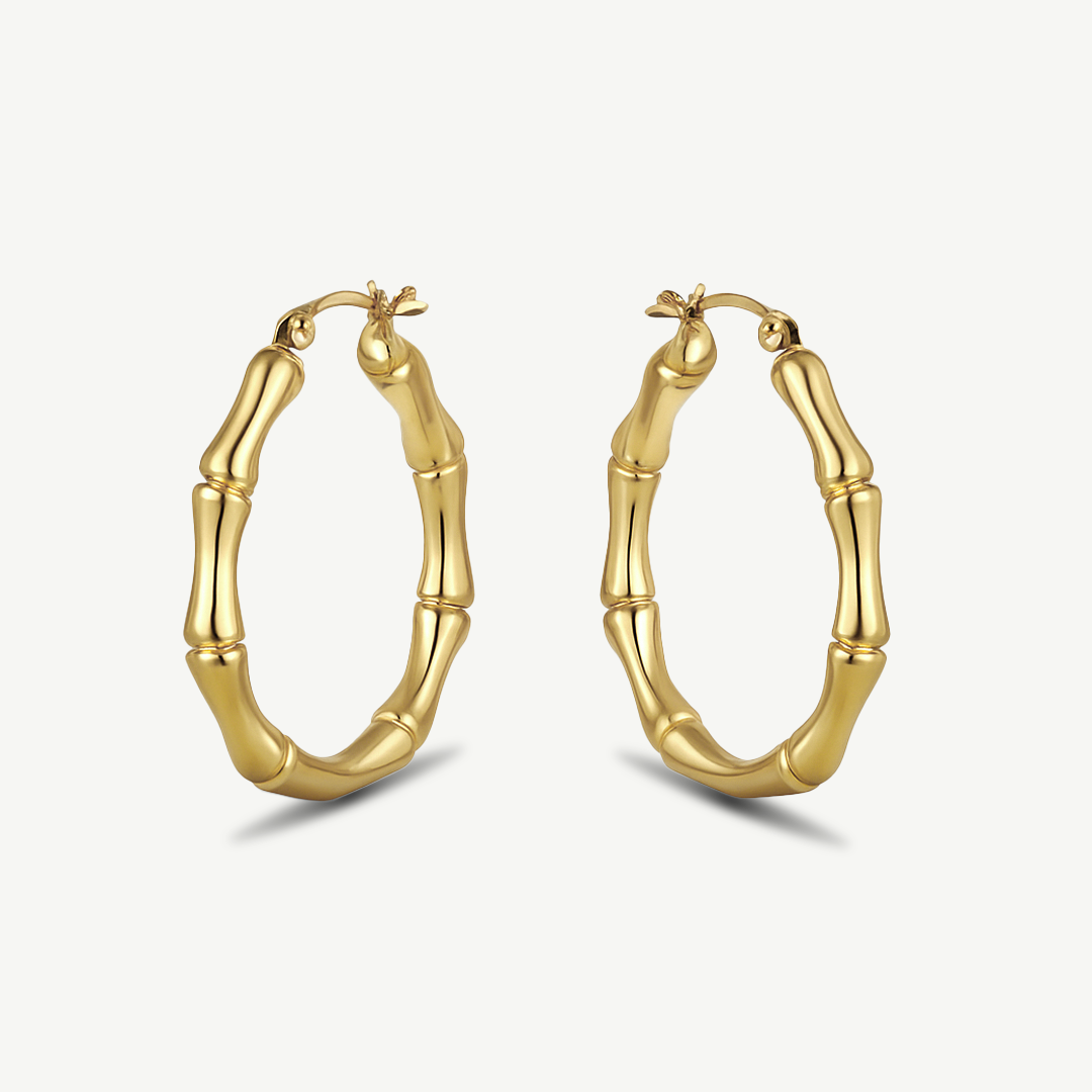 Orecchini a cerchio bombato tipo bamboo in oro giallo 14Kt. Diametro 3,7 cm circa e chiusura a scatto.