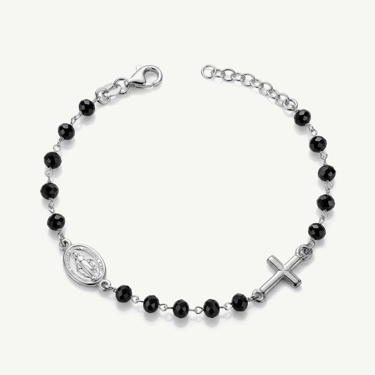La struttura richiama il classico rosario, impreziosita da una croce di circa 1 cm e da una medaglietta della Madonna di circa 1 cm, elementi simbolici che donano al bracciale un forte valore spirituale oltre che estetico. La lunghezza complessiva di circa 20 cm lo rende comodo e adatto alla maggior parte dei polsi, mentre la chiusura a moschettone garantisce praticità e sicurezza nell’indosso.