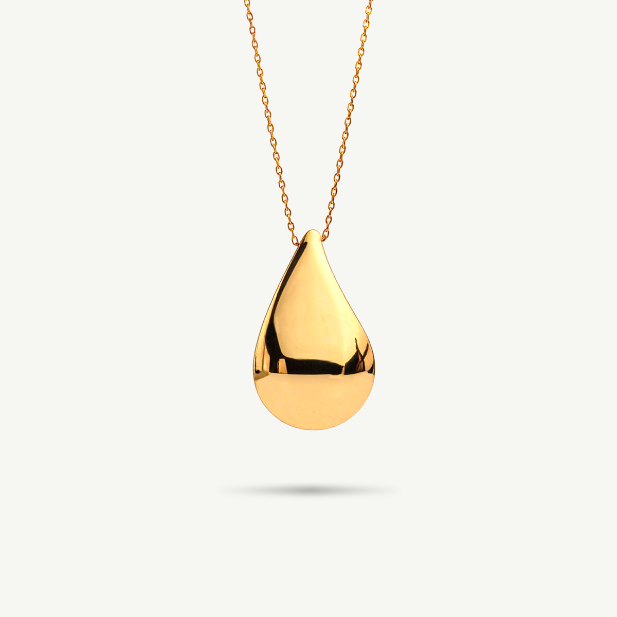 Girocollo a maglia rolò in oro giallo 9Kt con ciondolo a goccia. Lunghezza catenina 45 cm circa e chiusura a moschettone, ciondolo lunghezza 3 cm circa.