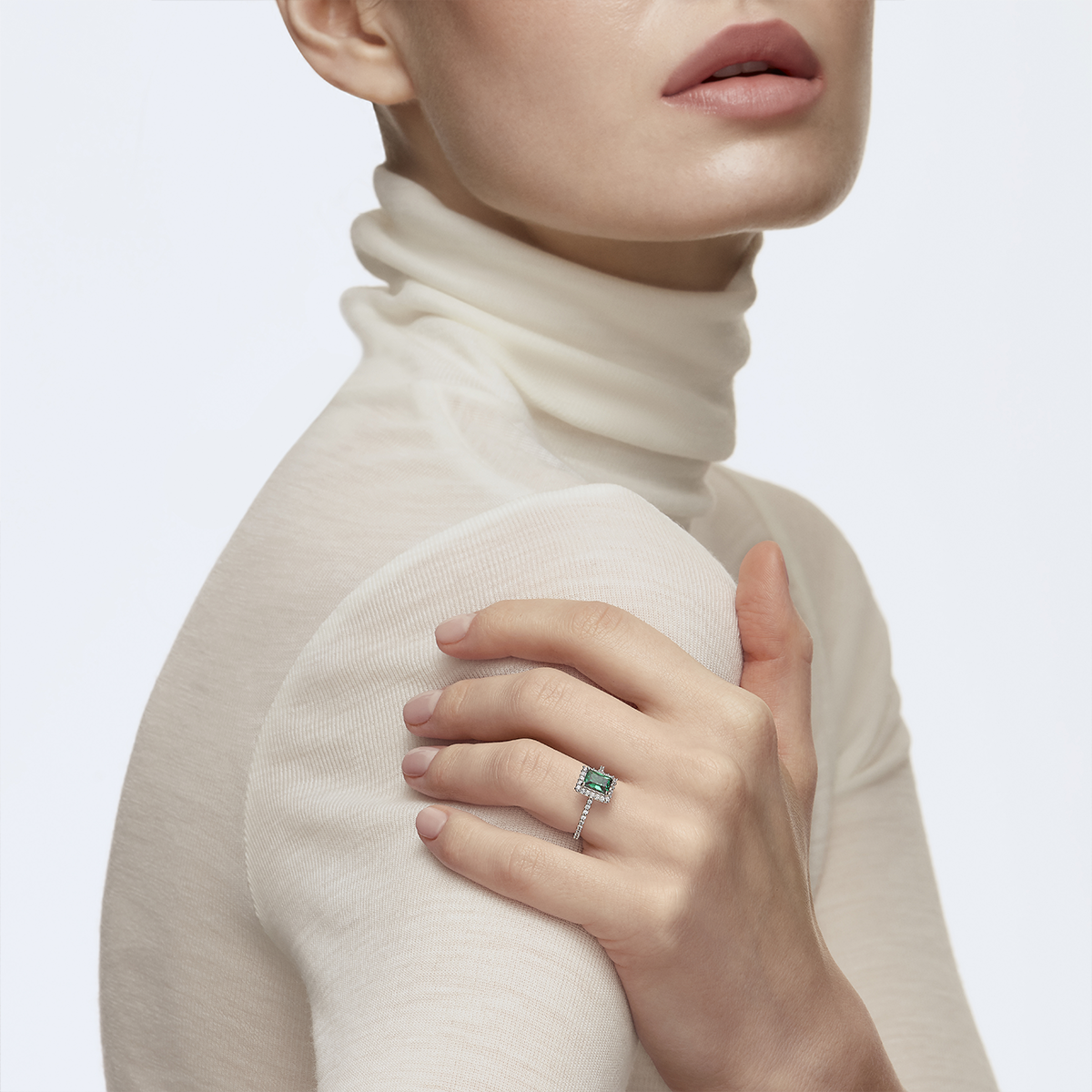Splendidamente elegante: questo anello Swarovski è impreziosito da una pietra verde in un’audace forma rettangolare. Una fila di pavé bianco circonda la pietra centrale, aggiungendo lustro al design. Brillante scintillio e design sofisticato fanno di questo anello la scelta ideale per impreziosire il tuo look per le occasioni speciali. Perfetto da abbinare ad altri gioielli e una fantastica idea regalo.