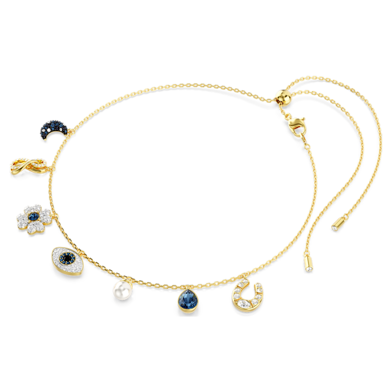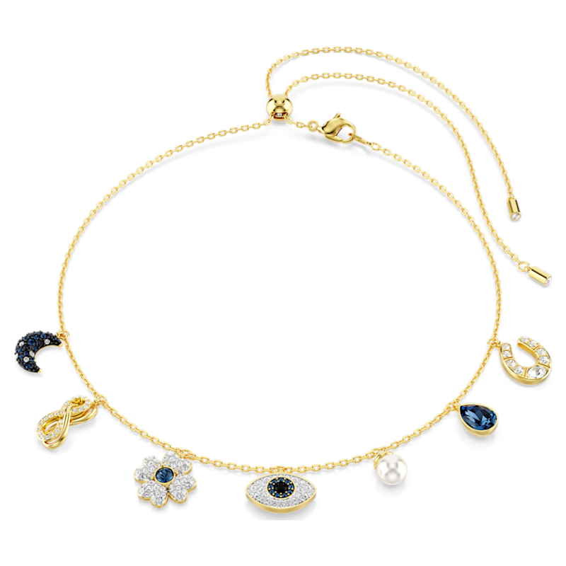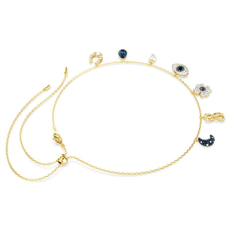 Lo stile incontra il misticismo in questo choker Symbolica di grande significato. Il gioiello presenta una delicata catena con sette simboli incastonati, tra cui un quadrifoglio, una falce di luna blu profondo, un simbolo dell’infinito, una goccia blu, una Crystal Pearl Swarovski con pavé, un ferro di cavallo e un Occhio di Allah bombato al centro. Ciascun elemento è impreziosito da cristalli, per aumentare la sensazione di meraviglia.