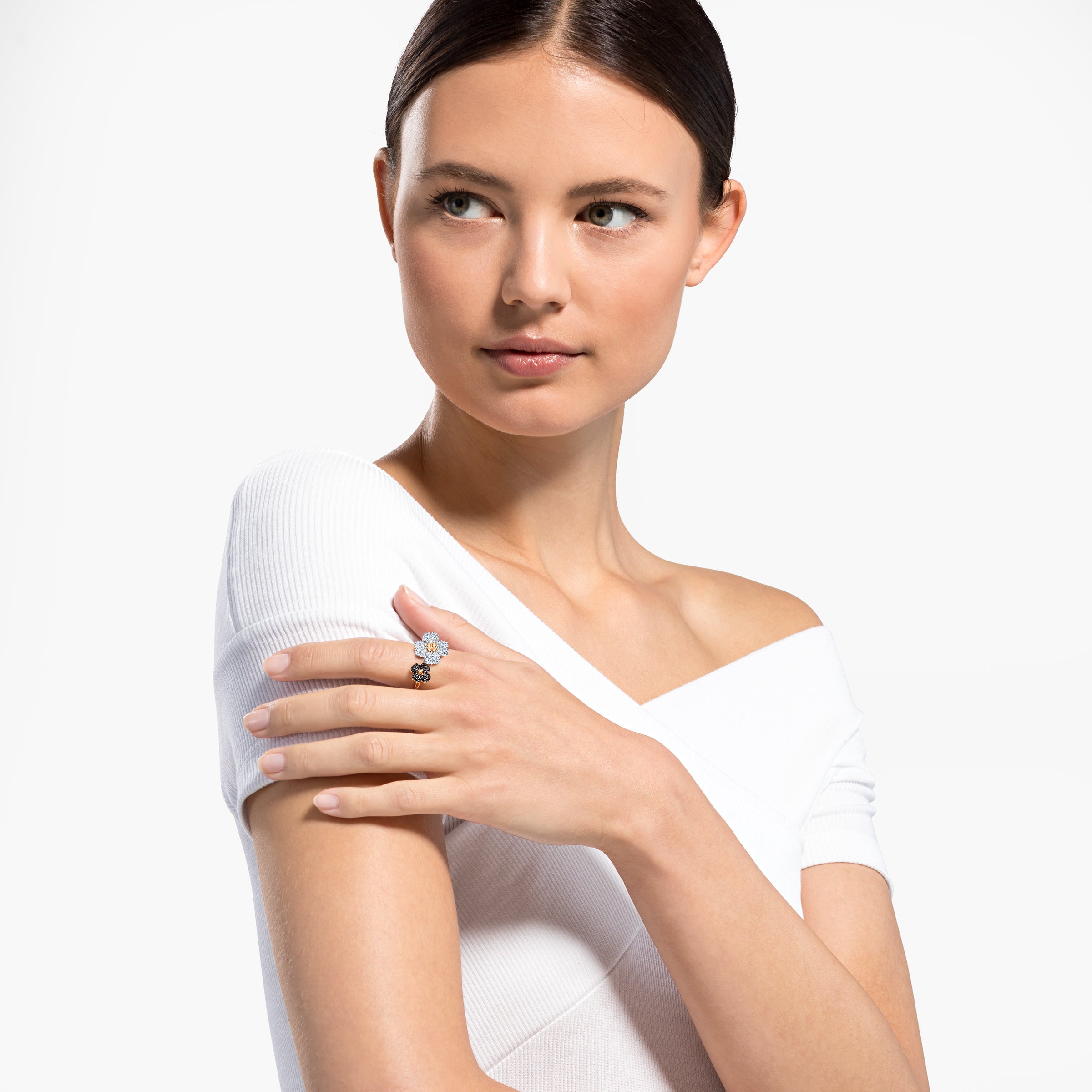 Questo moderno anello Swarovski è una delle nostre new entry nella collezione Latisha. Il suo design floreale presenta due quadrifogli stilizzati, simbolo di buona sorte. Grazie al look stupefacente ma anche casual, questo anello placcato nella tonalità oro rosa è adatto a un’ampia gamma di outfit. Un regalo affascinante e positivo per una persona vicina al tuo cuore.