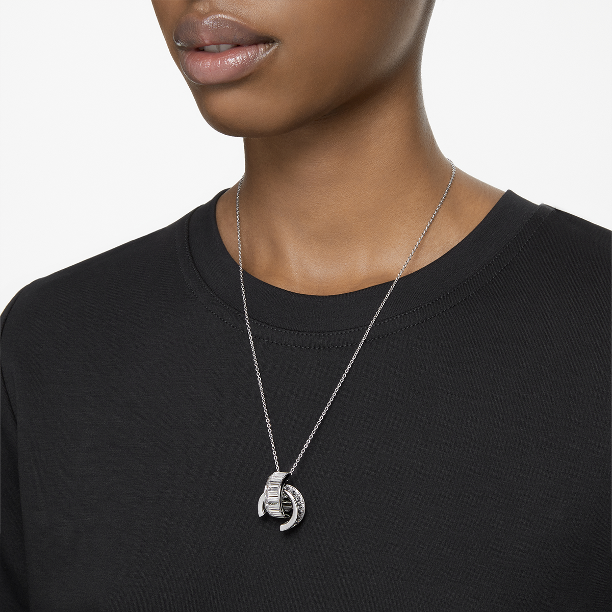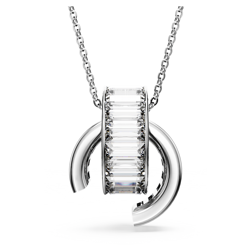 Questo pendente ultramoderno diventerà uno dei tuoi accessori preferiti per tutti i giorni. Con cristalli trasparenti taglio Baguette, questo pendente presenta forme ad incastro ispirate alla struttura a doppia elica del DNA ed è rifinito con una catena placcata in rodio. Indossalo da solo o insieme ai gioielli coordinati della famiglia Matrix.