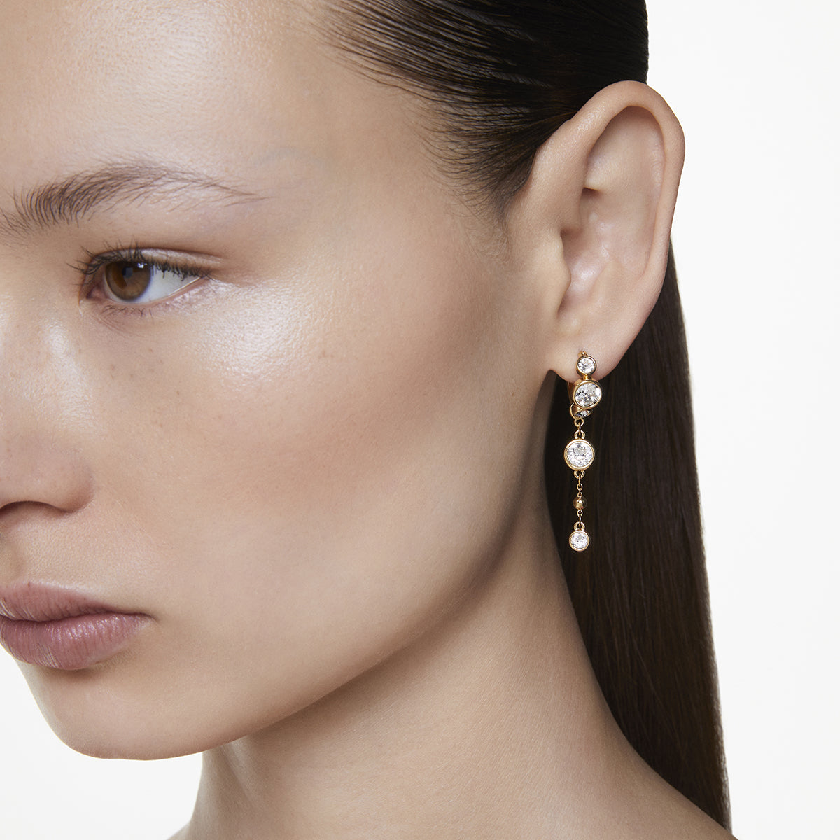 Pensati per catturare i raggi di luce ad ogni movimento, questi orecchini a buco sono un mezzo stupefacente per elevare qualsiasi outfit. Ciascun orecchino placcato color oro presenta un mini cerchio con una catenina pendente rimovibile, impreziosita da cristalli taglio Round in una tondeggiante montatura a castone e da una scintillante goccia di metallo. Una scelta versatile per chi vuole distinguersi da tutti.
