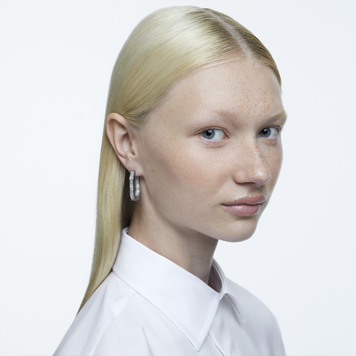 Inno alla sofisticata tecnica pavé di Swarovski, questi orecchini a cerchio medi taglio octagon, dai dettagli intricati e dalla struttura audace, esprimono modernità. Delicati cristalli bianchi posizionati su montature placcate rodio evidenziano un design di ispirazione industriale e si indossano da soli oppure sovrapposti sull’orecchio insieme ad altri pezzi della famiglia Dextera. Parte della famiglia Dextera, questi orecchini sono firmati dalla Direttrice creativa Giovanna Engelbert per la Collection II.