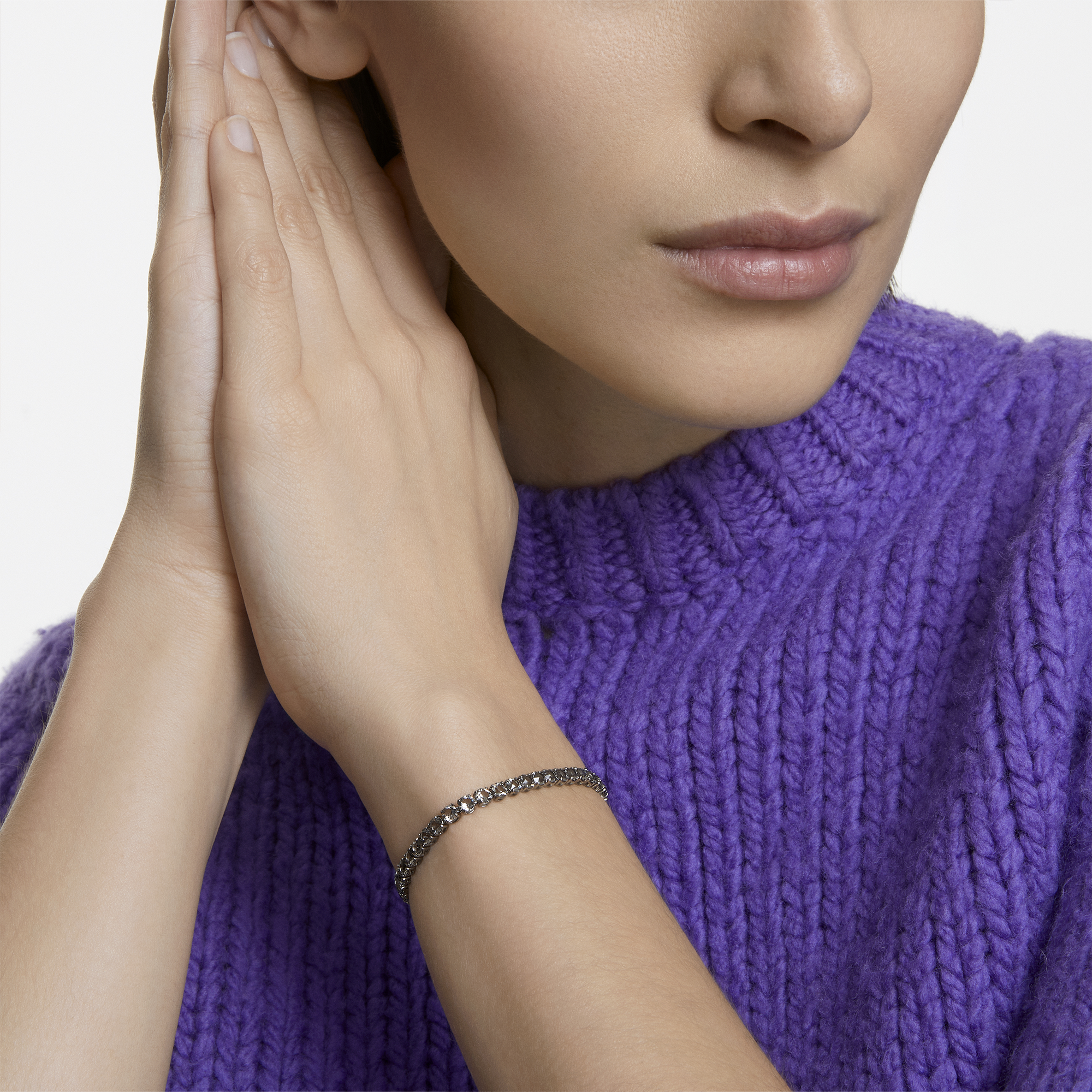 Ricco di soffuso scintillio e con un tocco contemporaneo, questo classico bracciale Tennis placcato rutenio è perfetto da rendere più o meno formale. Presenta un delicato strand di cristalli rotondi incastonati a griffe in una sfumatura di grigio scuro. Un “must” elegante e minimalista da indossare tutti i giorni.