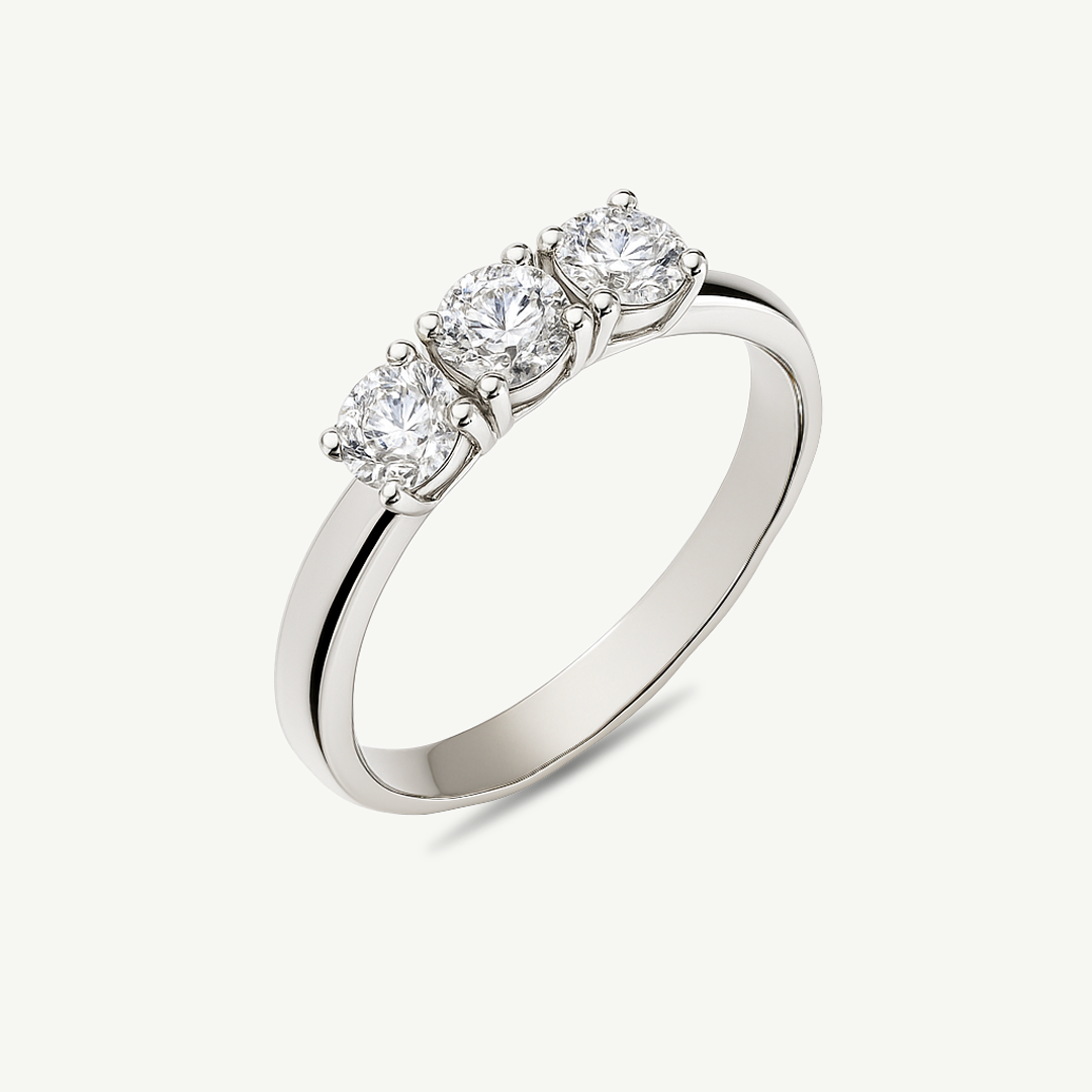 Brillante e raffinato, questo anello Fabiani in oro Bianco 9kt è impreziosito da tre zirconi luminosi taglio brillante, incastonati in una montatura classica che esalta la luce e la purezza delle pietre.