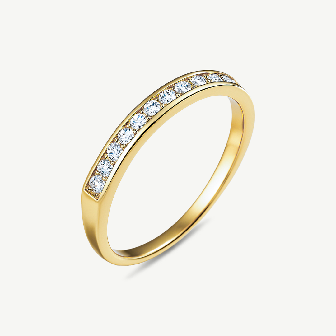 Semplicità ed eleganza si incontrano in questo anello riviera a binario in oro giallo 9kt, impreziosito da una fila di zirconi bianchi da circa 1 mm ciascuno. Il design essenziale ma raffinato, con montatura a binario, esalta la luce delle pietre e garantisce al tempo stesso una perfetta protezione.