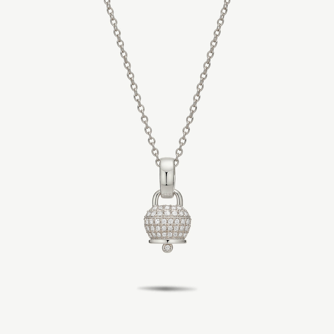 Raffinata e simbolica, questa collana in argento 925 presenta un elegante ciondolo a forma di campanella interamente ricoperto di zirconi bianchi pavé, per un effetto luminoso e prezioso.
