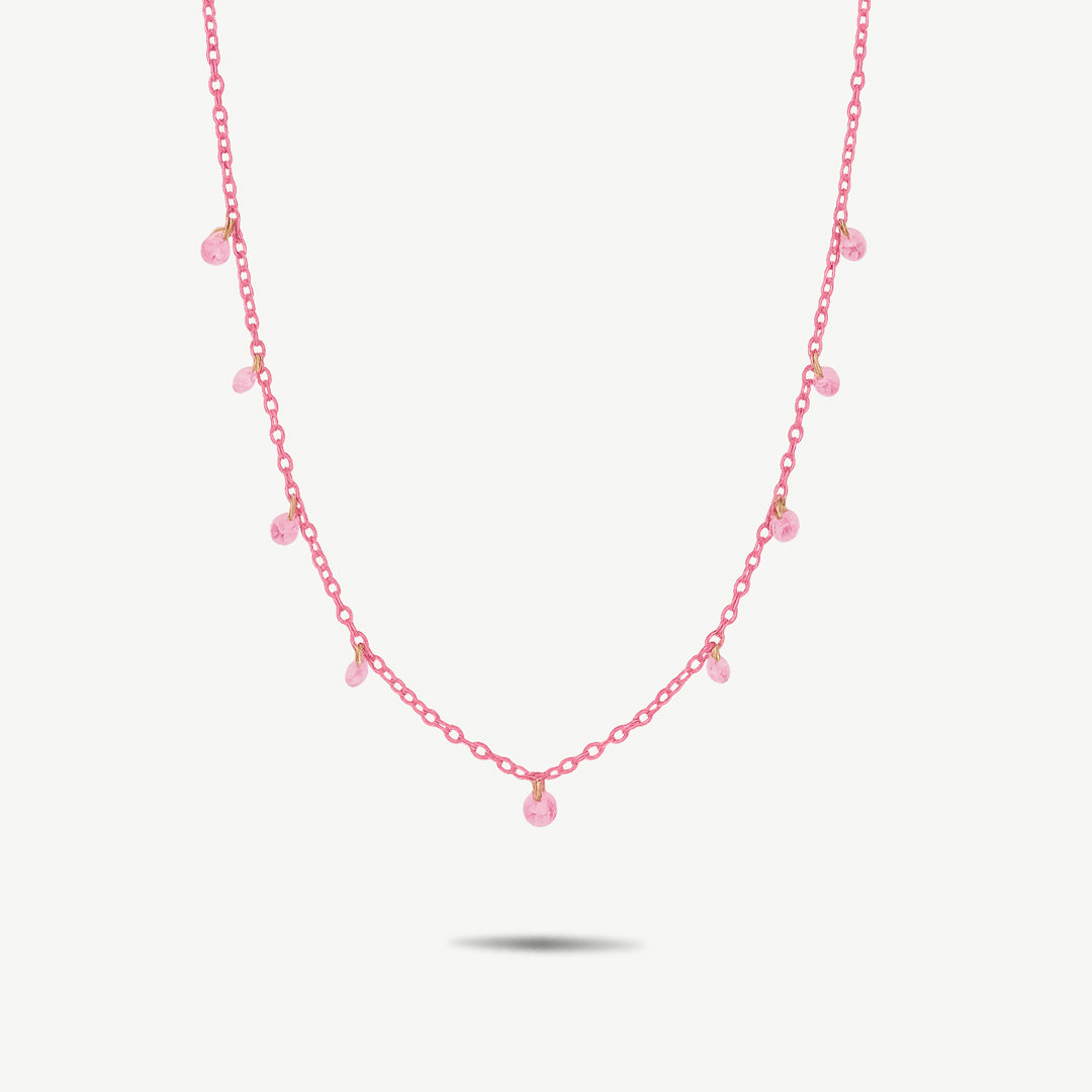 La catena sottile e leggera si adatta perfettamente al décolleté, rendendo il gioiello ideale sia per un look quotidiano colorato che per un’occasione speciale.
