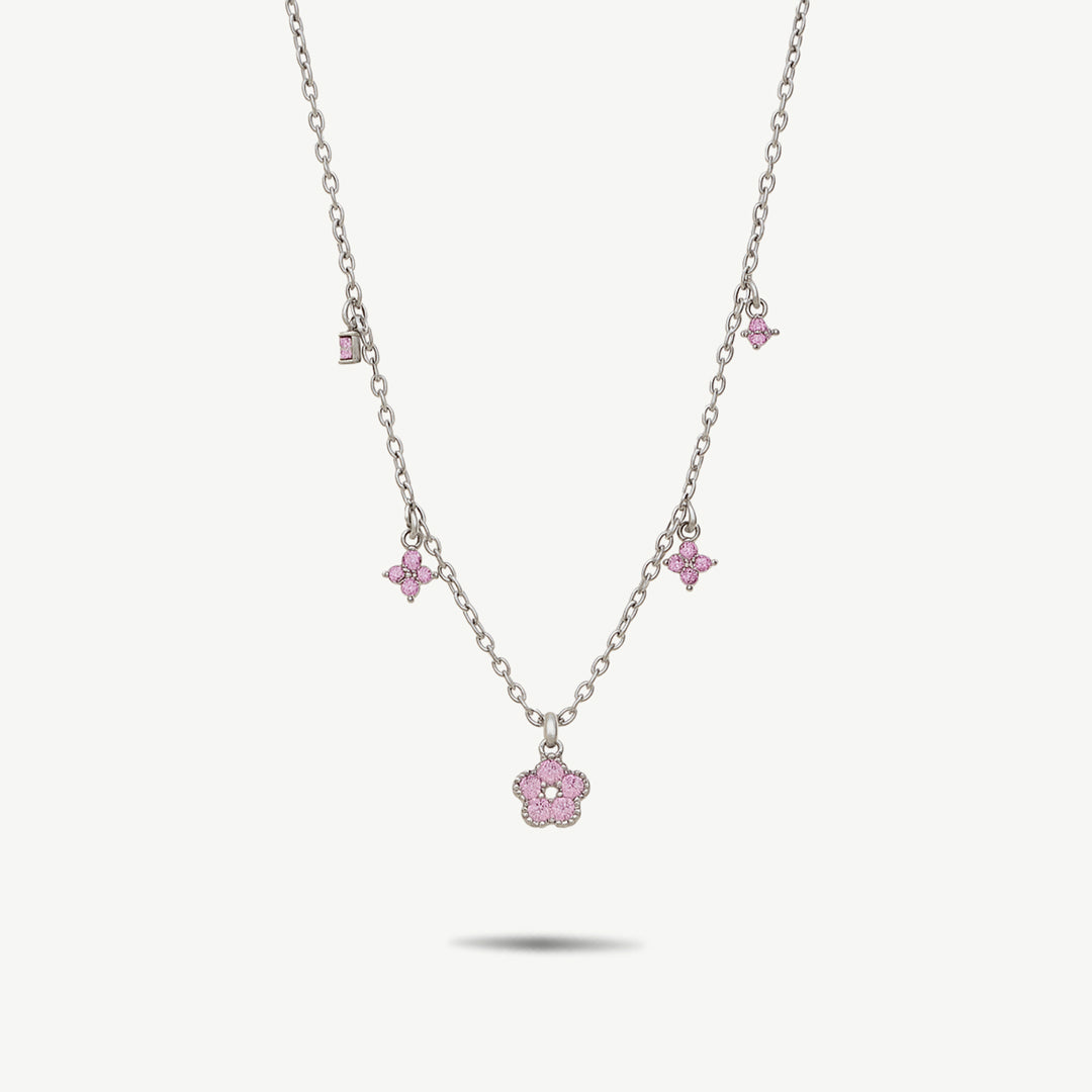 Una collana in argento con fiore e zirconi rosa che unisce romanticismo e raffinatezza, ideale per completare ogni look con eleganza discreta.