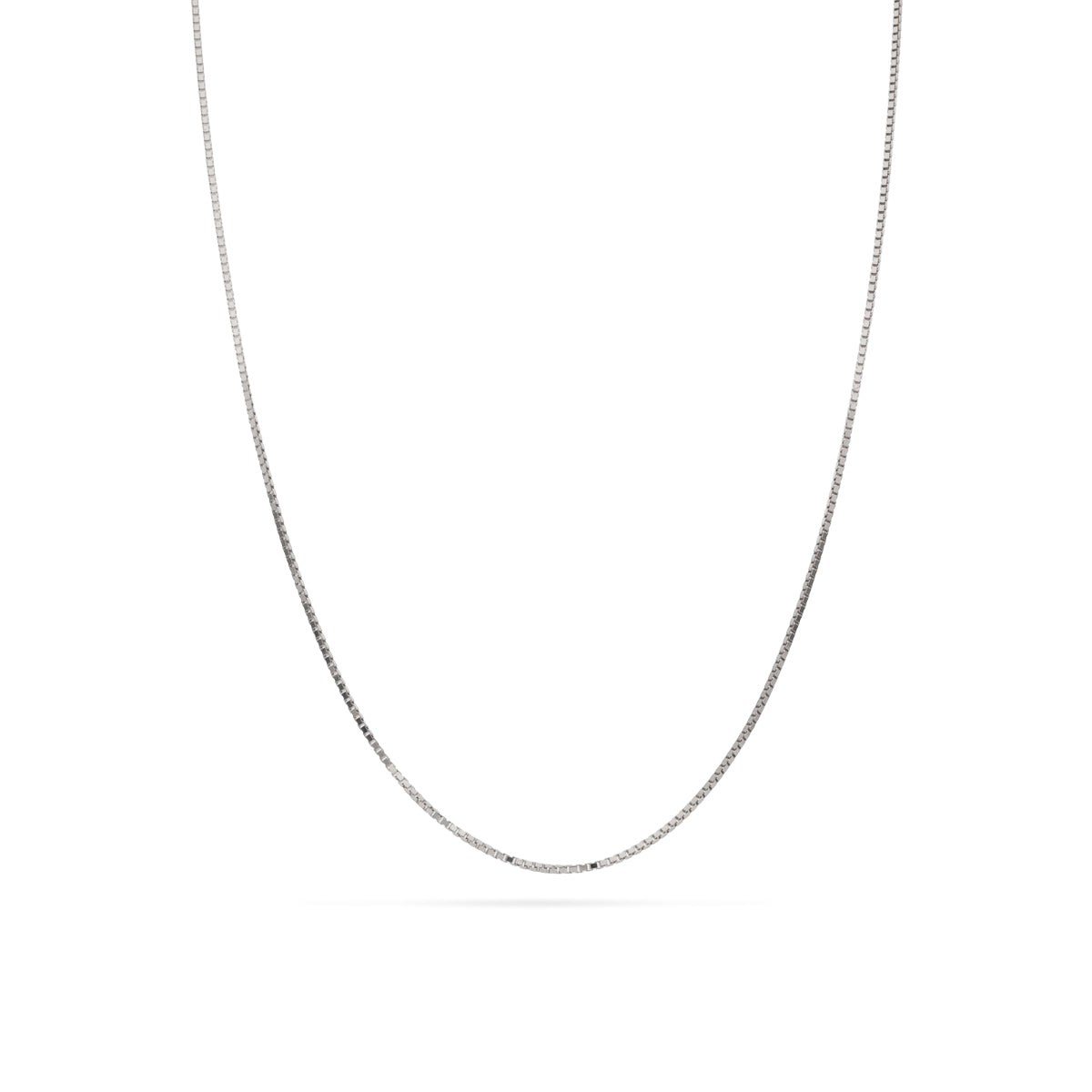 Questa catena sottile in oro Bianco 18 carati è un gioiello essenziale, elegante e senza tempo. Con una lunghezza di circa 45 cm, si adatta perfettamente al décolleté, risultando ideale sia indossata da sola per un look minimal e raffinato, sia abbinata a un ciondolo per un tocco più personalizzato.