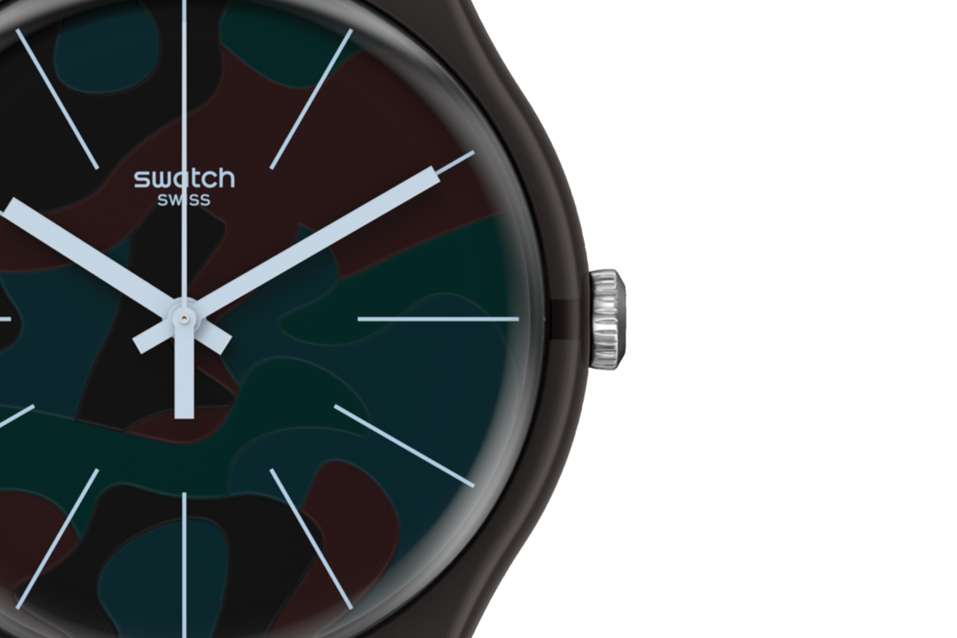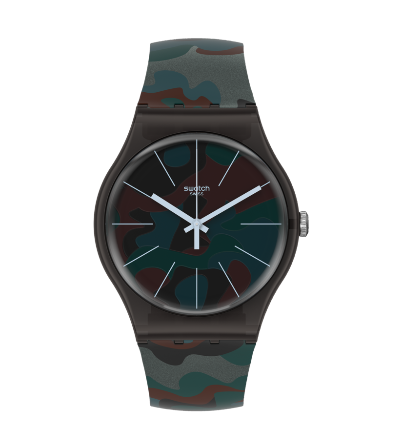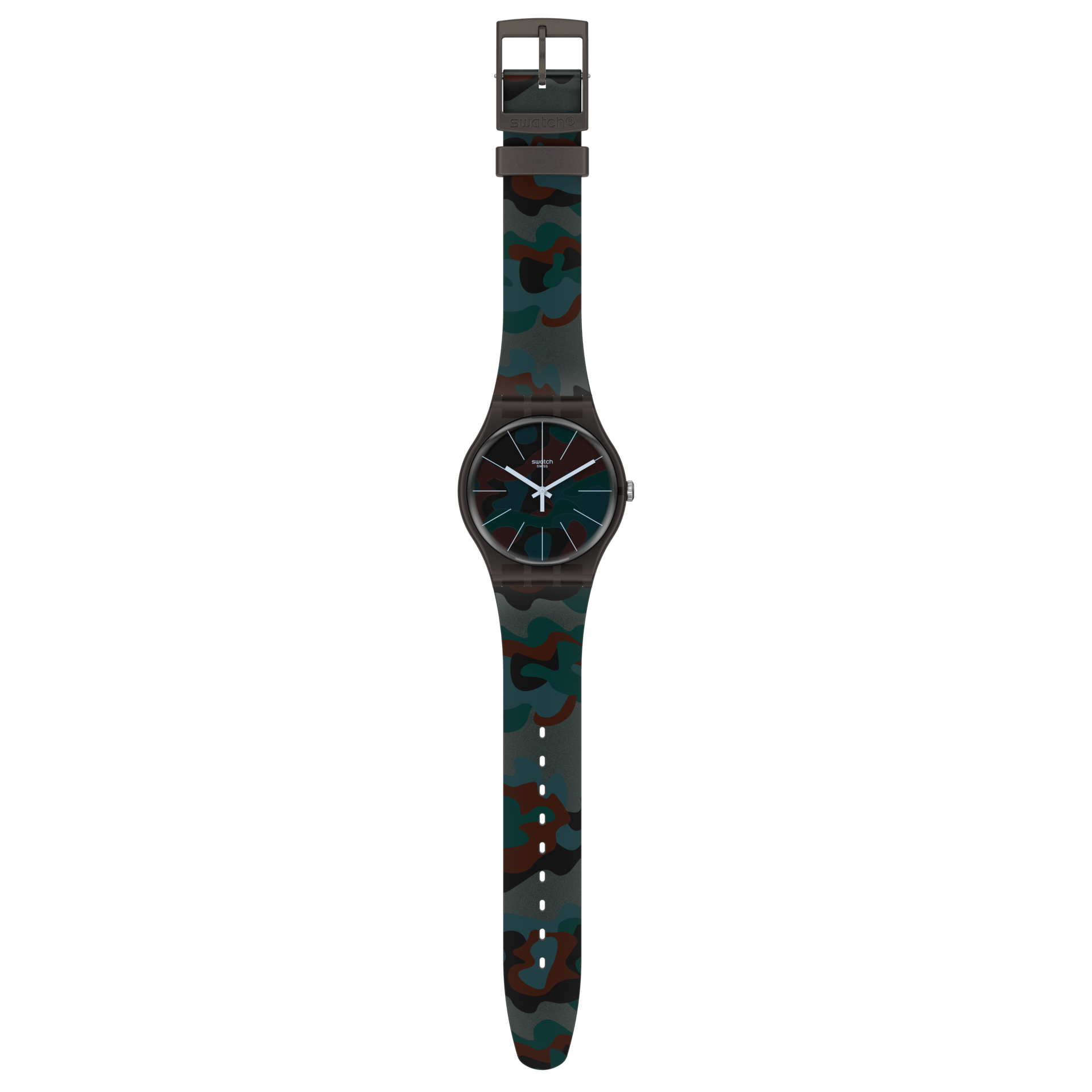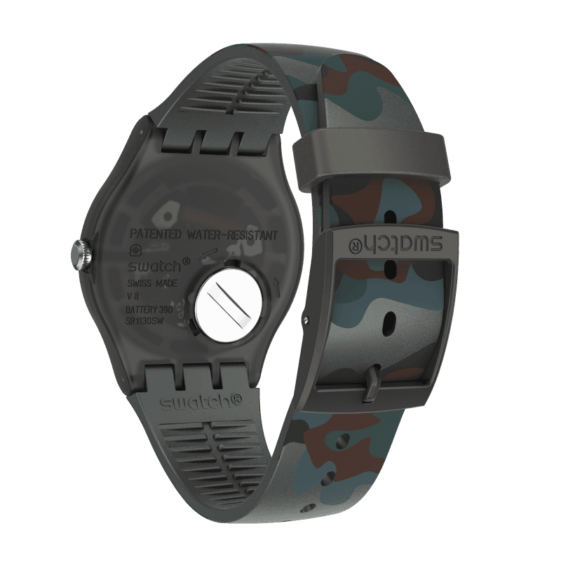 CAMOUCITY features an ultra-stylish dark camouflage print with a bold metallic effect. The same night camouflage print is visible on the black dial.