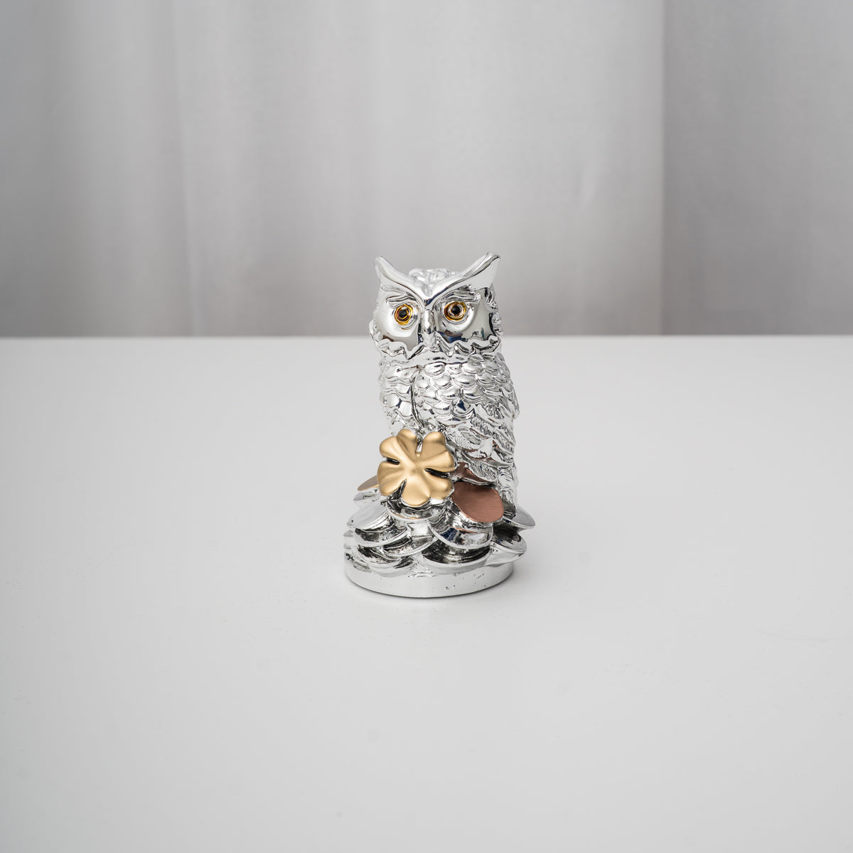 La statuina civetta argentata Meridien con quadrifoglio dorato è un elegante simbolo di saggezza, fortuna e prosperità. Realizzata con finitura effetto argento lucido, questa scultura si distingue per i dettagli dorati e per l’espressione curata che ne valorizza la raffinatezza artigianale.