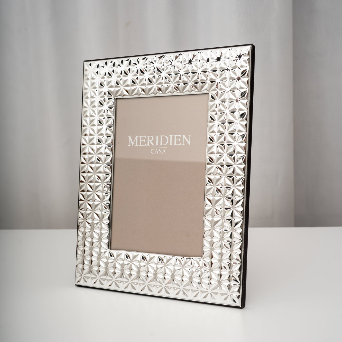 La cornice portafoto 13x18 Meridien è un elegante complemento d’arredo dal profilo argentato con raffinata texture geometrica in rilievo, capace di riflettere la luce con giochi di brillantezza e profondità. Il motivo tridimensionale crea un effetto luminoso e sofisticato che valorizza le fotografie, aggiungendo stile e personalità a qualsiasi ambiente.
