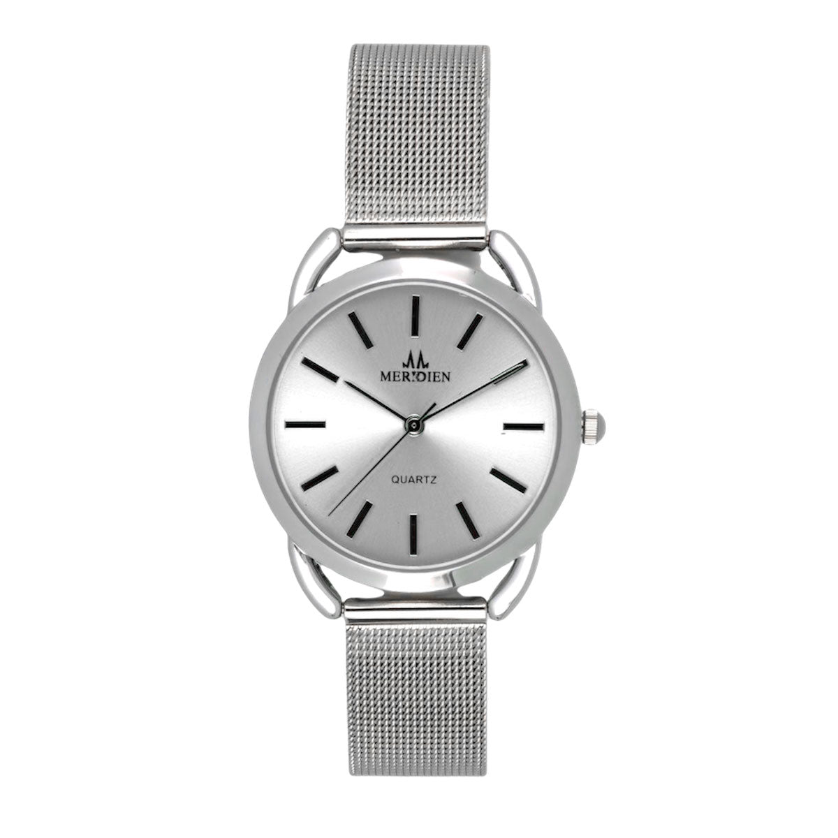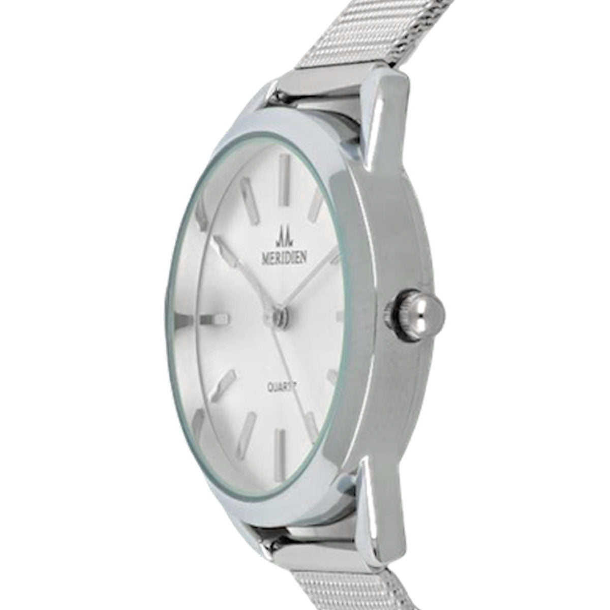 Meridien Megan analog watch, quartz movement, metal case and steel caseback, diameter approx. 32mm, steel bracelet. Water resistant.