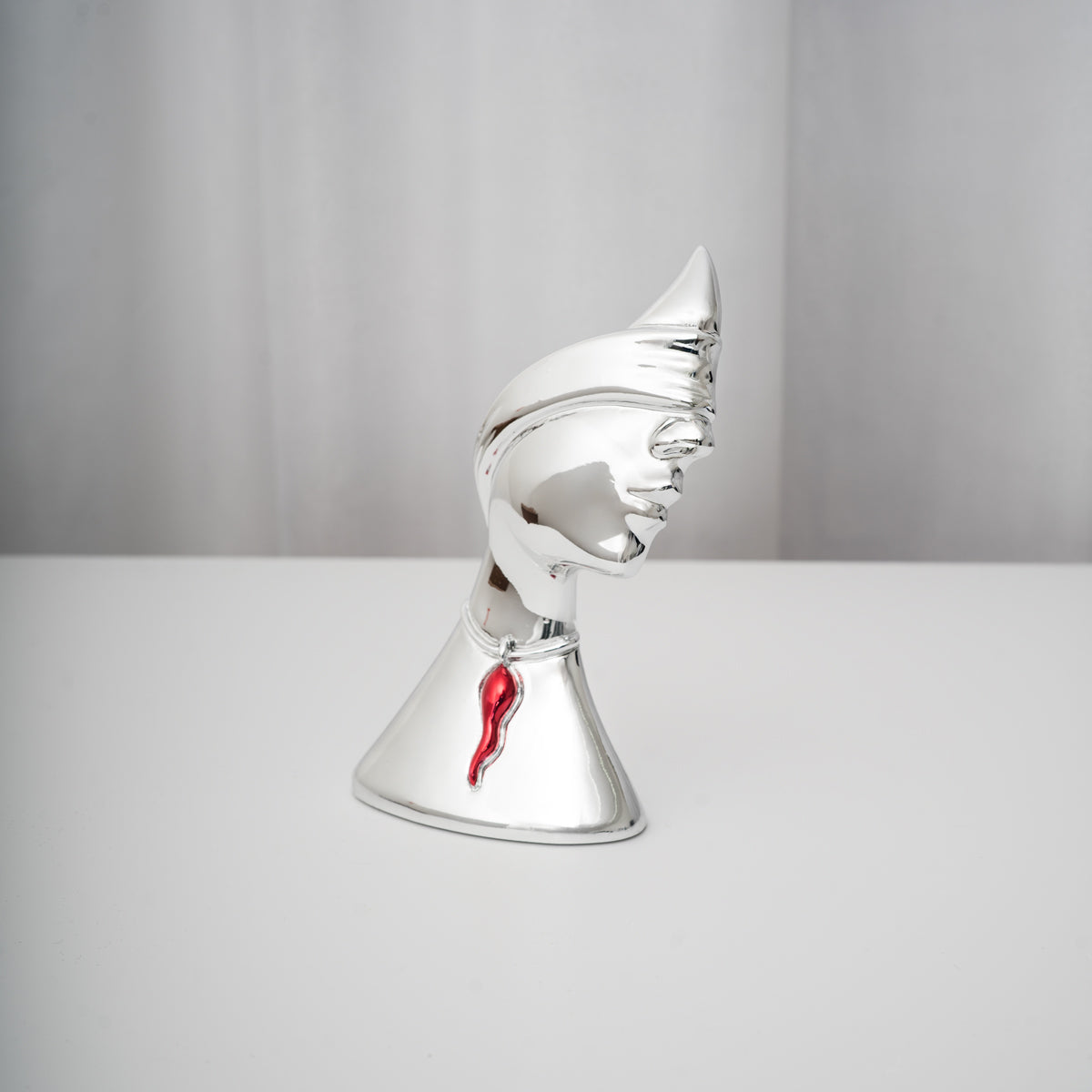 La dea bendata argentata con corno rosso Meridien 15x18 è una scultura elegante e simbolica, pensata per rappresentare la fortuna, la protezione e la prosperità. Il volto stilizzato e bendato raffigura il destino e la sorte, mentre il corno rosso — tradizionale simbolo portafortuna — aggiunge un tocco di colore e significato.