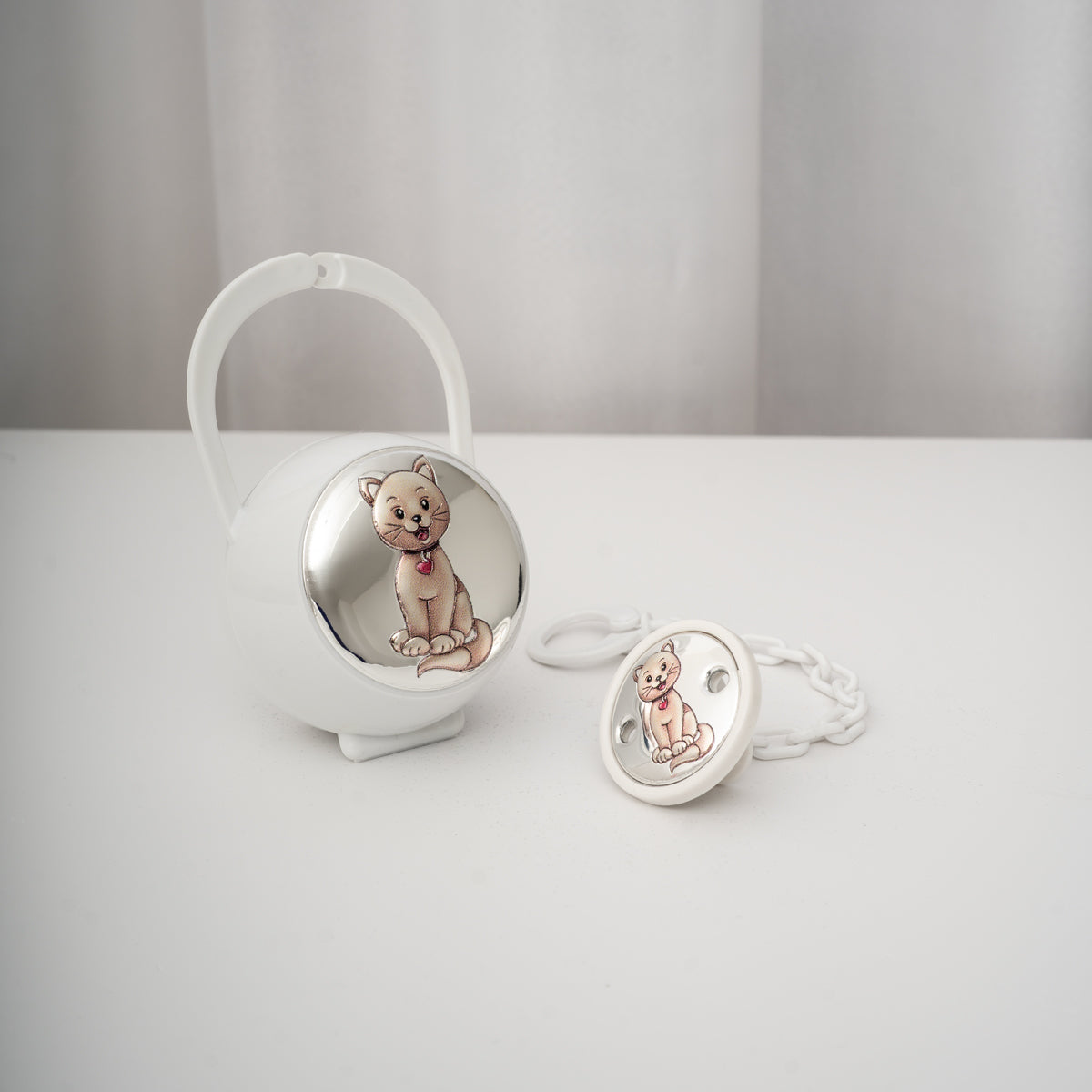 Il set catenella e portaciuccio gatto rosa Meridien è un dolce coordinato pensato per accompagnare i primi mesi dei più piccoli con stile e tenerezza. Il grazioso gattino, simbolo di dolcezza e affetto, dona un tocco delicato e raffinato al set, rendendolo ideale come regalo per nascita o battesimo.